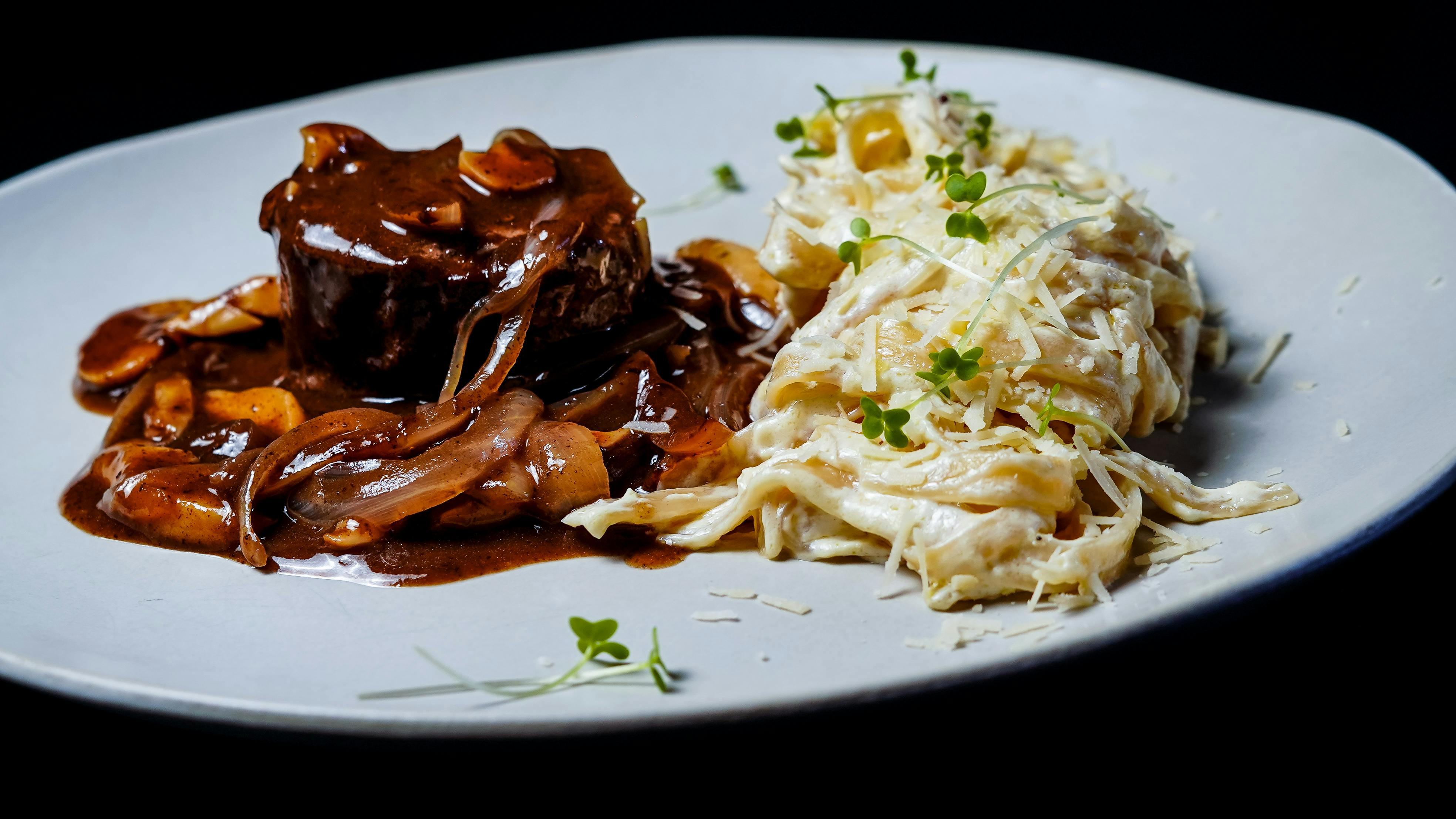 Handmade pasta tossed in a creamy mushroom sauce with herbs and parmesan, rich yet comforting.